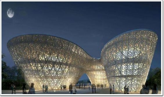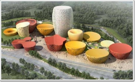 方案設(shè)計(jì)由著名的意大利阿克雅設(shè)計(jì)公司擔(dān)綱設(shè)計(jì),并聘請(qǐng)湖南省建筑設(shè)計(jì)院擔(dān)綱施工圖設(shè)計(jì)。本建筑以陶瓷器皿作為建筑物的外觀,結(jié)合展覽、住宿、綠化等功能,共同構(gòu)成建筑的意象屬性。建筑外形的設(shè)計(jì)完成了無序到有序的轉(zhuǎn)變,體現(xiàn)出空間形態(tài)的自由奔放、強(qiáng)力的符號(hào)化功能和地域文化特質(zhì)。陶瓷藝術(shù)城承擔(dān)著中國文明傳承和文化傳播的重要任務(wù),因此在外觀顏色和外墻裝飾上更多地考慮了中國傳統(tǒng)元素,在建筑外形上加深了變化的層次。